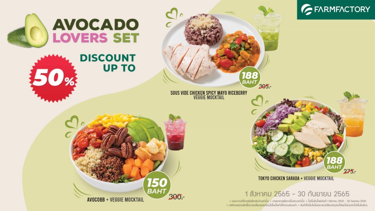 สำหรับ เช็ต “AVOCADO LOVERS SET” มีโปรโมชั่นสุดคุ้ม ลด 50% ทุกเมนู และแถมฟรี!! เครื่องดื่ม VAGGIE MOCKTAIL เติมเต็มความสดชื่นแก่ร่างกาย พร้อมบริการทั้ง 7 สาขา ได้แก่ สีลม คอมเพล็กซ์, สาทร สแควร์, ดิ เอ็มควอเทียร์, ออลซีซั่น เพลส, ฟอร์จูน ทาวน์, โฮมโปร บางนา กม.1 และเดอะมอลล์ ท่าพระ ตลอดจนทุกช่องทางเดลิเวอรี่ ตั้งแต่วันนี้ – 30 กันยายน 2565 …สาวกอะโวคาโดห้ามพลาด!!! ทั้งนี้ สามารถติดตามรายละเอียดเพิ่มเติม ได้ที่ Facebook fanpage : https://www.facebook.com/farmfactoryworld/ หรือ โทร. 02-800-8000