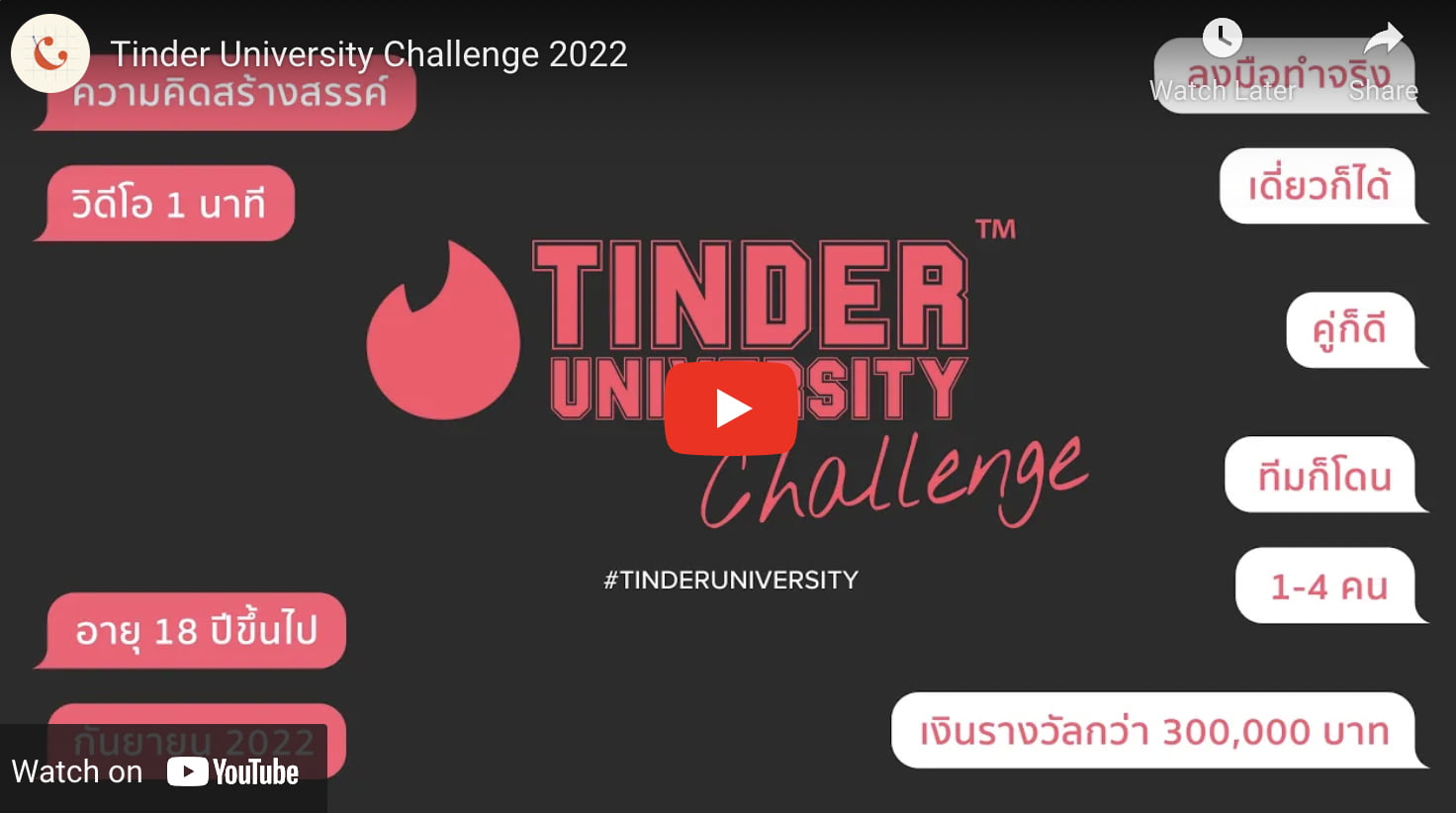 Tinder จึงได้จัดกิจกรรมสุดคลู “Tinder University Challenge” เชิญชวนนิสิตนักศึกษาออกมาโชว์ความสามารถ ปล่อยพลังความคิดสร้างสรรค์ แบ่งปันประสบการณ์ในการออกเดท ตั้งแต่การเริ่มการทักแชทเพื่อเริ่มต้นคุยเพื่อลดความอึดอัดระหว่างกัน หรือสเป็กของคนที่คู่ควรจะมาเป็นคู่เดท ฯลฯ ด้วยวิดีโอสั้นๆในแบบของตัวเอง พร้อมชิงเงินรางวัลรวมมูลค่ากว่า 300,000 บาท สำหรับผู้ชนะสามอันดับแรก พร้อมสิทธิเข้าร่วม Tinder University Exclusive Party ในวันพุธที่ 12 ตุลาคม 2565 นี้ และของรางวัลอื่นๆ อีกเพียบ!