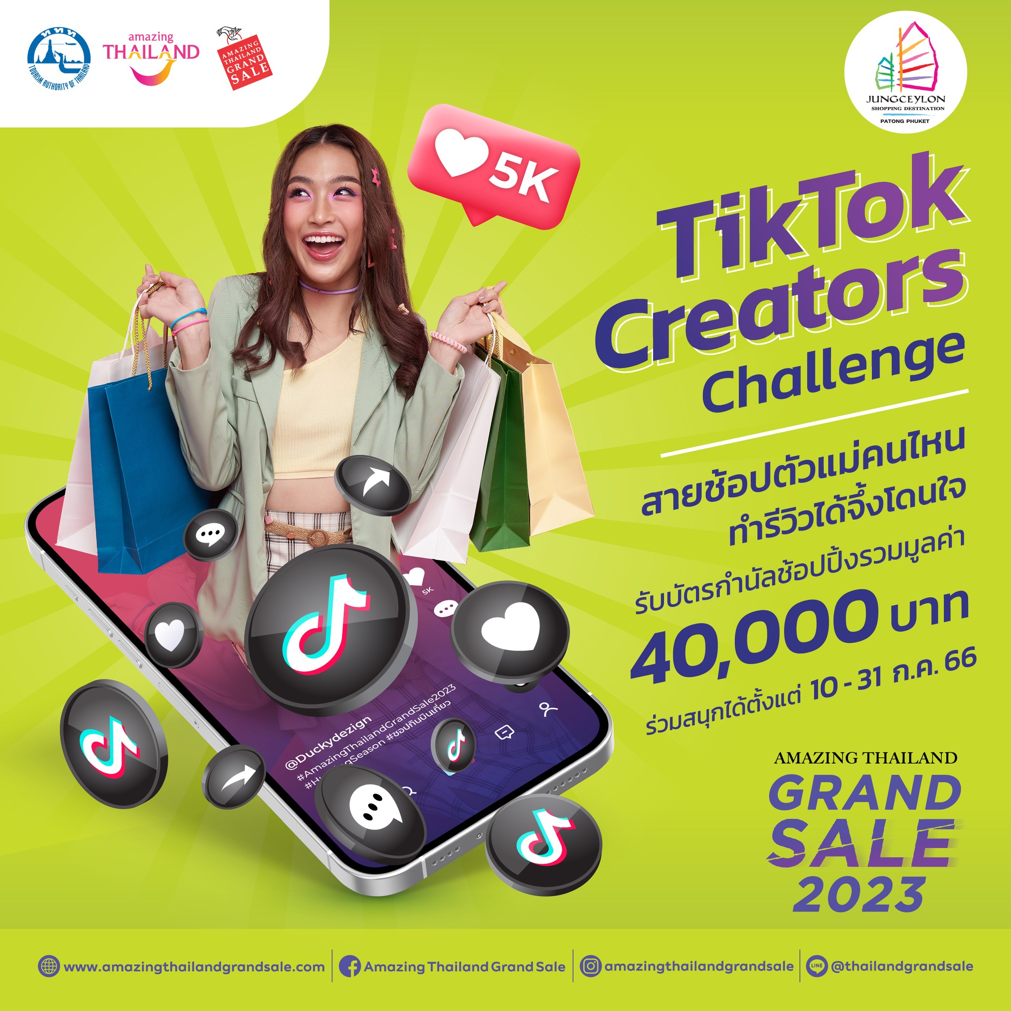 ศูนย์การค้าจังซีลอน ป่าตอง ภูเก็ต ร่วมกับ การท่องเที่ยวแห่งประเทศไทย (ททท.) ภายใต้โครงการ Amazing Thailand Grand Sale 2023 ขอเชิญชวนขาช้อปสายรีวิว มาร่วมสนุกลุ้นรับของรางวัลกับกิจกรรม “TikTok Creators Challenge” เพียงทำคลิปคอนเทนต์รีวิวสินค้าที่อยู่ภายในศูนย์การค้าจังซีลอน ป่าตอง ภูเก็ต อย่างสร้างสรรค์ จากนั้นโพสต์ลงบนช่องทาง “TikTok” ของตนเอง ตั้งเปิดเป็นสาธารณะ พร้อมเขียนแคปชั่นและติดแฮชแท็ก #GrandSale2023 #HuntingSeason #Jungceylon แล้ว Tag มาที่ @jungceylonofficial ก็สามารถลุ้นรับบัตรกำนัล    ช้อปปิ้งมูลค่า 2,000 บาท (จำนวน 10 รางวัล) เมื่อมียอด Engagement ครบ 5,000 (รวมกดหัวใจ, คอมเมนต์, รีโพสต์) แล้วส่งข้อความมาที่เพจ Facebook: Amazing Thailand Grand Sale และรอข้อความตอบกลับยืนยันสิทธิ์