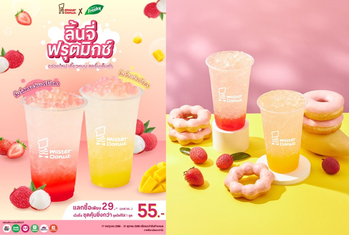 มิสเตอร์ โดนัท ชวน Freshy ไซรัป รังสรรค์เมนูเครื่องดื่มดับร้อน กับ “ลิ้นจี่ฟรุตมิกซ์” ชงสดใหม่ทุกแก้ว จัดเต็มเนื้อผลไม้และเม็ดบุกสไตล์ญี่ปุ่น อร่อย เคี้ยวหนึบ สดชื่นเต็มคำ !!