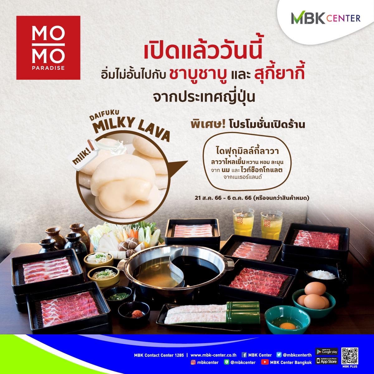 ศูนย์การค้าเอ็ม บี เค เซ็นเตอร์ ขนทัพร้านอาหารเปิดใหม่รัว ๆ เอาใจสายกิน ชวนอิ่มไม่อั้นกับชาบูชาบูและสุกี้ยากี้ชื่อดังต้นตำรับความอร่อยจากญี่ปุ่น โม โม พาราไดซ์ (Mo Mo Paradise) เปิดให้บริการแล้ววันนี้ที่ชั้น 7 โซน B พร้อมจัดโปรโมชันสุดพิเศษฉลองเปิดร้าน ฟินกับไดฟุกุมอลล์กี้ลาวา ลาวาไหลเยิ้ม หอมหวานละมุนจากนมและไวท์ช็อกโกแลตจากเนเธอร์แลนด์ ตั้งแต่วันนี้ – ศุกร์ที่ 6 ตุลาคม 2566 (หรือจนกว่าสินค้าหมด)