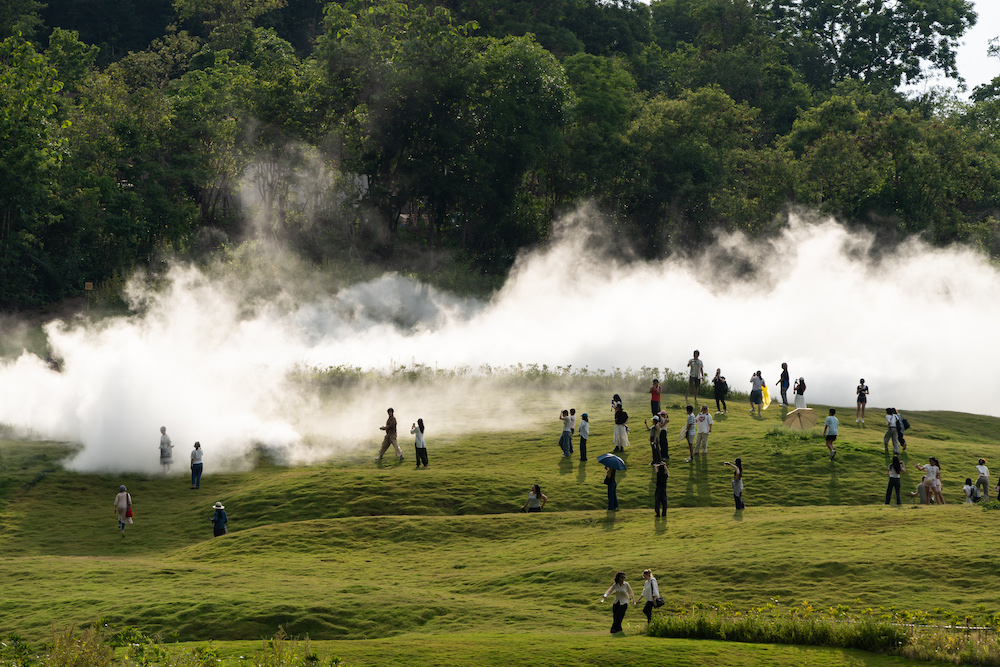 การเสพศิลป์ที่ Khao Yai Fog Forest ไม่ได้จำกัดอยู่แค่การมองด้วยตา แต่เป็นการใช้ ทุกประสาทสัมผัสเพื่อรับรู้ถึงตัวตนของศิลปะอย่างแท้จริง คุณจะได้สัมผัสกับความเย็นและความชื้นจากละอองหมอกที่กระทบผิว ได้ยินเสียงน้ำและเสียงลมที่พัดผ่าน ได้กลิ่น ไอดินและต้นไม้ชุ่มน้ำ และมองเห็นการเคลื่อนไหวของม่านหมอกที่โอบล้อมรอบตัว เป็นประสบการณ์ที่ดึงเราออกจากโลกดิจิทัลและเชื่อมต่อกับธรรมชาติและศิลปะได้อย่างลึกซึ้ง นับเป็นการเปิดประสบการณ์การชมงานศิลปะในรูปแบบใหม่ที่หาได้ยากในปัจจุบันนอกจากความสวยงามแล้ว หมอกยังเป็นสื่อที่น่าสนใจอย่างยิ่ง “หมอกทำให้สิ่งที่มองเห็นกลายเป็นมองไม่เห็น และทำให้สิ่งที่มองไม่เห็น เช่น อากาศ ความชื้น และสายลม กลายเป็นสิ่งที่มองเห็นได้” ความพิเศษนี้คือสิ่งที่ทำให้ผลงานของฟูจิโกะ นากายะ ดูสดชื่นและมีชีวิตชีวา เพราะผู้ชมจะมองเห็นการเคลื่อนไหวของสายลมที่พัดพาหมอกไปในทิศทางต่าง ๆ ทำให้ Khao Yai Fog Forest เป็นมากกว่าการชมงานศิลปะ แต่เป็นการเปิดประสบการณ์ใหม่ที่ปลุกเร้าทุกประสาทสัมผัส ทั้งการมองเห็น การ ได้ยิน และการสัมผัสความเคลื่อนไหวของหมอกที่เปลี่ยนไปเรื่อย ๆ นี่คือโอกาสที่คุณจะได้มาพบกับประสบการณ์ที่ไม่สามารถพบเห็นได้ในชีวิตประจำวัน แต่เป็นปรากฏการณ์ที่น่าจดจำและตราตรึงอยู่ในความทรงจำตลอดไป