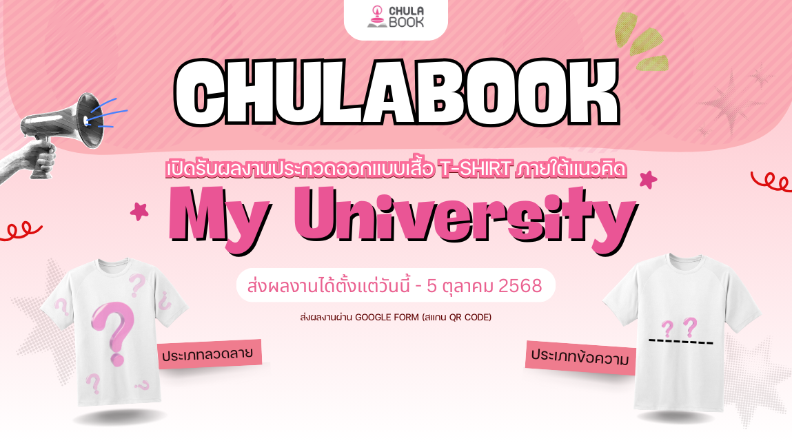 ศูนย์หนังสือจุฬาฯ ขอเชิญนิสิตนักศึกษาปัจจุบัน บุคลากร และอาจารย์ในจุฬาลงกรณ์มหาวิทยาลัย ร่วมประกวดออกแบบเสื้อ T-shirtภายใต้แนวคิด “My University” ชิงเงินรางวัลรวมกว่า 40,000 บาท ผู้ที่มีสิทธิ์เข้าร่วม: นิสิตนักศึกษาปัจจุบัน บุคลากร และอาจารย์ ในจุฬาฯ เปิดรับผลงาน ตั้งแต่ บัดนี้ ถึง วันที่ 5 ตุลาคม 2568 ประกาศผล วันที่ 10 ตุลาคม 2568 ทาง www.chulabook.com และ Platform Chula book อื่นๆ