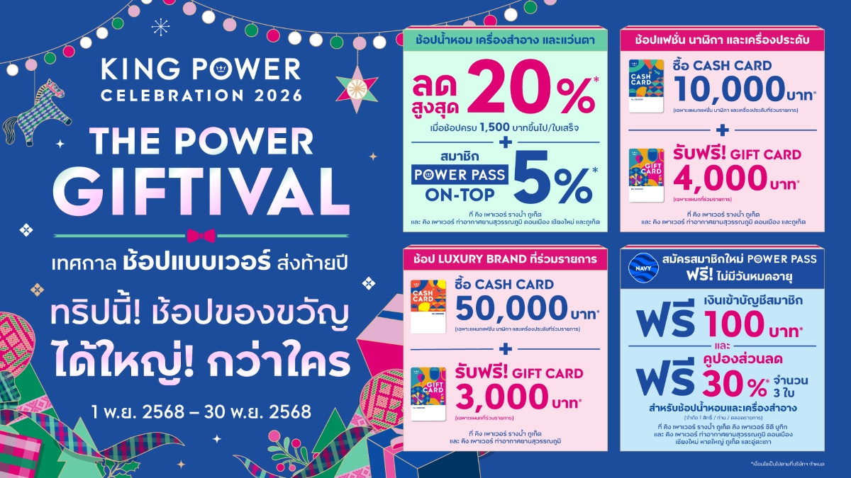 คิง เพาเวอร์ จัดแคมเปญ “KING POWER CELEBRATION 2026 THE POWER GIFTIVAL เทศกาล ช้อปแบบเวอร์ ส่งท้ายปี” เพื่อมอบสิทธิพิเศษแทนคำขอบคุณแก่ลูกค้าทุกท่านในช่วงปลายปี ด้วยข้อเสนอแห่งความคุ้มค่าในทุกการช้อป รับส่วนลดสูงสุด 20% เมื่อช้อปสินค้าแผนกน้ำหอม เครื่องสำอาง แว่นตา ที่ร่วมรายการครบ 1,500 บาทขึ้นไป/ใบเสร็จ พิเศษ! สำหรับสมาชิก POWER PASS รับส่วนลด ON-TOP เพิ่มอีก 5% ที่ คิง เพาเวอร์ รางน้ำ ภูเก็ต และ คิง เพาเวอร์ ท่าอากาศยานสุวรรณภูมิ ดอนเมือง เชียงใหม่ และภูเก็ต ตั้งแต่วันนี้ – 30 พฤศจิกายน 2568