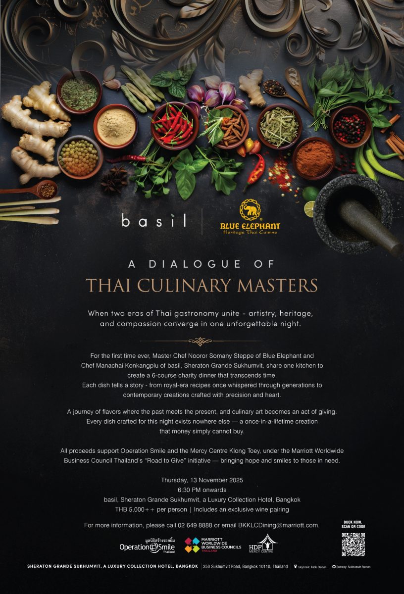 ค่ำคืนแห่งการรังสรรค์นี้จะจัดขึ้นในวันพฤหัสบดีที่ 13 พฤศจิกายน 2568 ณ ห้องอาหาร basil ไม่เพียงเป็นมื้อค่ำสุดพิเศษ หากแต่เป็นการเดินทางข้ามกาลเวลา ผ่านรสชาติ ความทรงจำ และความเมตตา เพื่อสนับสนุนองค์กร Operation Smile และ Mercy Centre คลองเตย ภายใต้โครงการ “Road to Give” โดย Marriott Worldwide Business Council Thailand