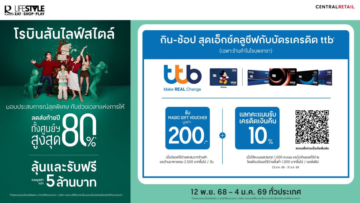 ศูนย์การค้าโรบินสันไลฟ์สไตล์ ในเครือเซ็นทรัล รีเทล ร่วมกับ บัตรเครดิต ttb เดินหน้าต่อยอดความสุขในช่วงส่งท้ายปีนี้ กับแคมเปญ “โรบินสันไลฟ์สไตล์ มอบประสบการณ์สุดพิเศษ กับช่วงเวลาแห่งการให้” จัดเต็มประสบการณ์กิน-ช้อปส่งท้ายปีแบบคุ้มค่า ครอบคลุมทุกไลฟ์สไตล์ ทั้งการช้อปปิ้ง รับประทานอาหาร และกิจกรรมบันเทิงต่างๆ รับส่วนลดทั้งศูนย์การค้าฯ สูงสุด 80% รวมทั้ง ลุ้นและรับฟรี! รวมมูลค่ากว่า 5 ล้านบาท พร้อมส่งมอบความเอ็กซ์คลูซีฟเฉพาะลูกค้าบัตรเครดิต ttb ให้ได้ช้อปของขวัญโดนใจ พร้อมอิ่มคุ้มกับมื้อสุดพิเศษกับสิทธิพิเศษเหนือระดับ ตั้งแต่วันที่ 23 ต.ค. 68 – 4 ม.ค. 68 ที่โรบินสันไลฟ์สไตล์ทุกสาขาทั่วประเทศ ได้แก่