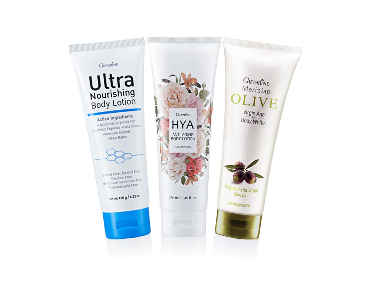 ตัวแรกที่ขาดไม่ได้อย่าง ‘กิฟฟารีน เมอริเนี่ยน โอลีฟ เวอร์จิ้น เอจ บอดี้ ไวท์’ (Giffarine Merinian Olive Virgin Age Body White) โลชั่นบำรุงผิวกายเข้มข้น มีสารอาหารบำรุงผิว และน้ำมันมะกอก ออร์แกนิก เอ็กซ์ตร้า เวอร์จิ้น เข้มข้นมากถึง 6 % เพื่อช่วยฟื้นฟูผิว เติมความชุ่มชื้น ผิวดูเรียบเนียนขึ้น มีความกระจ่างใส และสีผิวสม่ำเสมอ พร้อมปกป้องผิวด้วยสารป้องกันแสงแดด