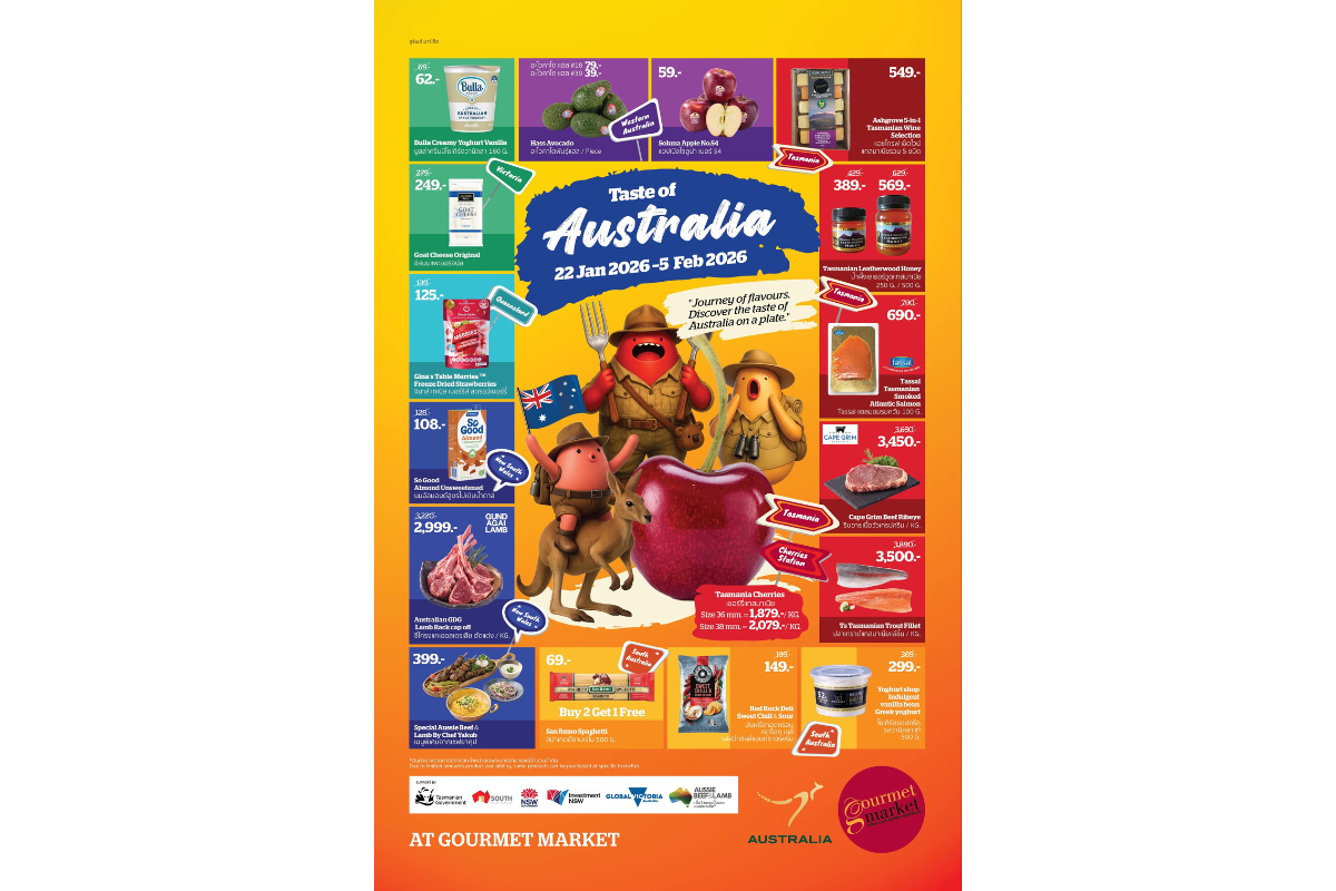 กูร์เมต์ มาร์เก็ต ร่วมกับ สถานทูตออสเตรเลีย และ สำนักงานการพาณิชย์และการลงทุนออสเตรเลีย (ออสเทรด) เปิดโลกความอร่อยสไตล์ออสซี่ในงาน “Taste of Australia 2026 ” กับคอนเซ็ปต์นักเดินทางล่าความอร่อย JOURNEY OF FLAVOURS – DISCOVER THE TASTE OF AUSTRALIA ON A PLATE เส้นทางแห่งรสชาติ…สู่ความอร่อยทั่วออสเตรเลีย จาก 6 รัฐ อาทิ เชอร์รี่ และ เนื้อวัว จาก แทสมาเนีย เนื้อแกะออสเตรเลีย จาก นิวเซาท์ เวลส์ หอยเป๋าฮื้อกรีนลิป และ แอปเปิลโซลูน่า เบอร์ 54 จาก เวสเทิร์น ออสเตรเลีย สตรอวเบอรี่อบแห้ง จีน่า เทเบิล เมอร์รี่ส์ สตรอว์เบอร์รี่ จาก ควีนส์แลนด์ ซันเรโม แองเจิลแฮร์ พาสต้าเป็นเส้นพาสต้าที่บางที่สุด จากเซาท์ ออสเตรเลีย และ บูลล่า ครีมมีโยเกิร์ต วานิลลา จาก วิคตอเรีย ตั้งแต่วันที่ 22 มกราคม – 5 กุมภาพันธ์ 2569 ณ กูร์เมต์มาร์เก็ต ทุกสาขา