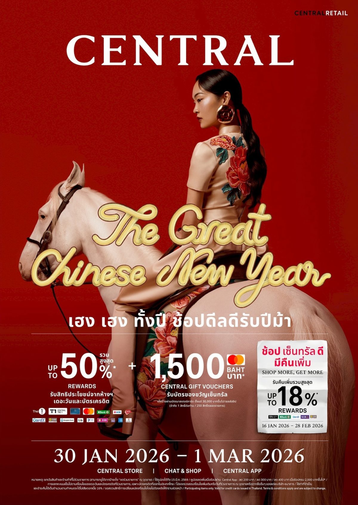 ห้างสรรพสินค้าเซ็นทรัล ในเครือเซ็นทรัล รีเทล ผนึกกำลังพันธมิตรชั้นนำและบัตรเครดิตเซ็นทรัล เดอะวัน มอบประสบการณ์ช้อปปิ้งสุดพิเศษเสริมสิริมงคลครบทุกมิติด้วยข้อเสนอ “เฮง เฮง ทั้งปี ช้อปดีลดี รับปีม้า” กับแคมเปญ “The Great Chinese New Year 2026” ตอกย้ำความเป็นแลนด์มาร์กแห่งการเฉลิมฉลองเทศกาลตรุษจีนอย่างยิ่งใหญ่ เติมโชคลาภ รับทรัพย์ตลอดเทศกาล พร้อมคัดสรรของไหว้ตรุษจีน สินค้าระดับพรีเมียมอย่างพิถีพิถันครบทุกหมวดหมู่ และตอบโจทย์ การเปลี่ยนแปลงรับศักราชใหม่ไปกับคอลเลกชันล่าสุดทั้ง แฟชั่น บิวตี้ เครื่องประดับ ของแต่งบ้าน รวมทั้งไอเทมสินค้า มงคลที่ “Chinese New Year Market” เพื่อให้เลือกช้อปรับความเฮงครบจบในที่เดียว ควบคู่ความสนุกกับไฮไลต์กิจกรรมและการตกแต่งบรรยากาศธีมตรุษจีน ถ่ายทอดความหมายของพลังม้าไฟในฐานะสัญลักษณ์แห่งความมุ่งมั่น และการก้าวหน้า เพื่อเริ่มศักราชใหม่ อย่างมั่นใจในทุกมิติ ที่ห้างเซ็นทรัลทุกสาขาทั่วประเทศและช่องทางออนไลน์ ตั้งแต่ วันที่ 30 มกราคม 2569 – วันที่ 1 มีนาคม 2569
