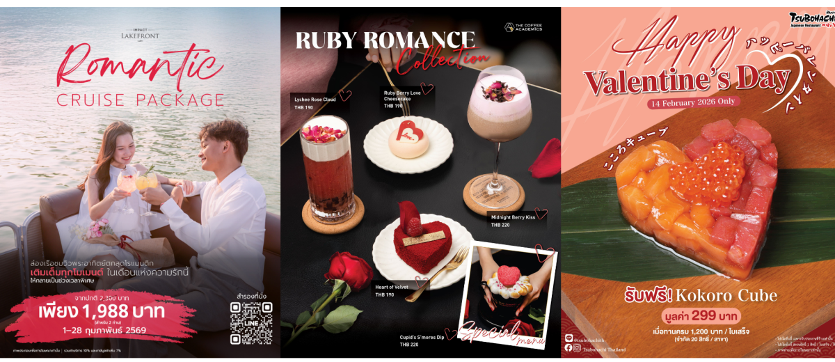 - โรแมนติกเหนือระดับกลางทะเลสาบ กับ “อิมแพ็ค เลคฟร้อนท์” (IMPACT Lakefront) ยกระดับความหวานด้วยแพ็กเกจ “Romantic Cruise Package 2026” ในราคาเพียง 1,988 บาท (สำหรับ 2 ท่าน) สัมผัสประสบการณ์ล่องเรือชมพระอาทิตย์ตกดิน ณ ทะเลสาบเมืองทองธานี พร้อมจิบเครื่องดื่มพิเศษ และรับฟรีบัตรกำนัลอาหารมูลค่า 1,200 บาท สำหรับใช้บริการต่อเนื่องที่ร้าน (บัตรกำนัลใช้ได้ถึง 31 มี.ค. 69) สำรองที่นั่งล่วงหน้าอย่างน้อย 1 วัน