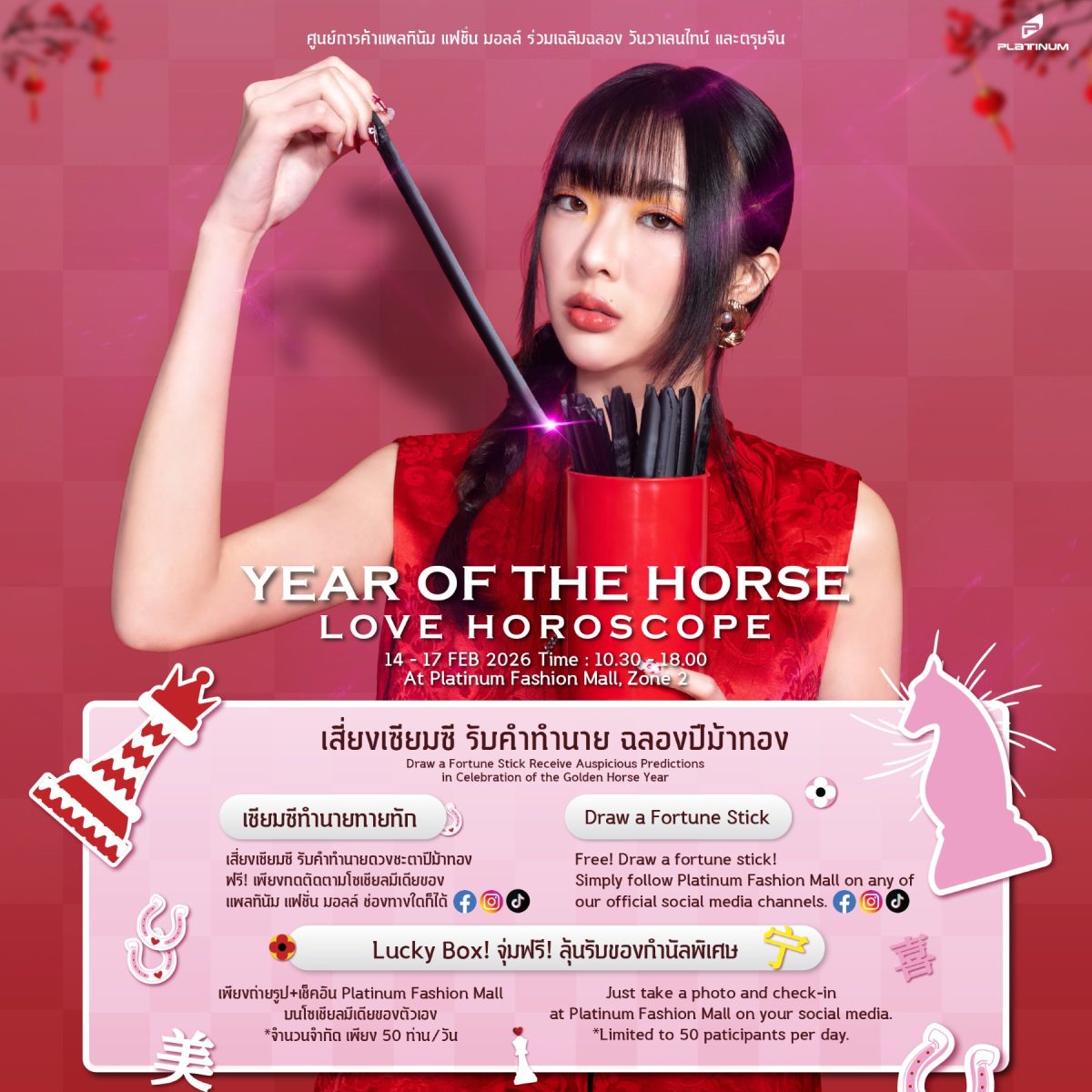 และพลาดไม่ได้กับกิจกรรมสุดสนุก “Year of the Horse Love Horoscope” เสี่ยงเซียมซี รับคำทำนาย ฉลองปีม้าทอง พร้อมลุ้นรับของที่ระลึกมงคลจากแพลทินัม ผ่านกิจกรรมจุ่ม Lucky Box ณ บริเวณประตูทางเข้าชั้น 1 โซน 2 ตั้งแต่วันที่ 14 – 17 กุมภาพันธ์ 2569