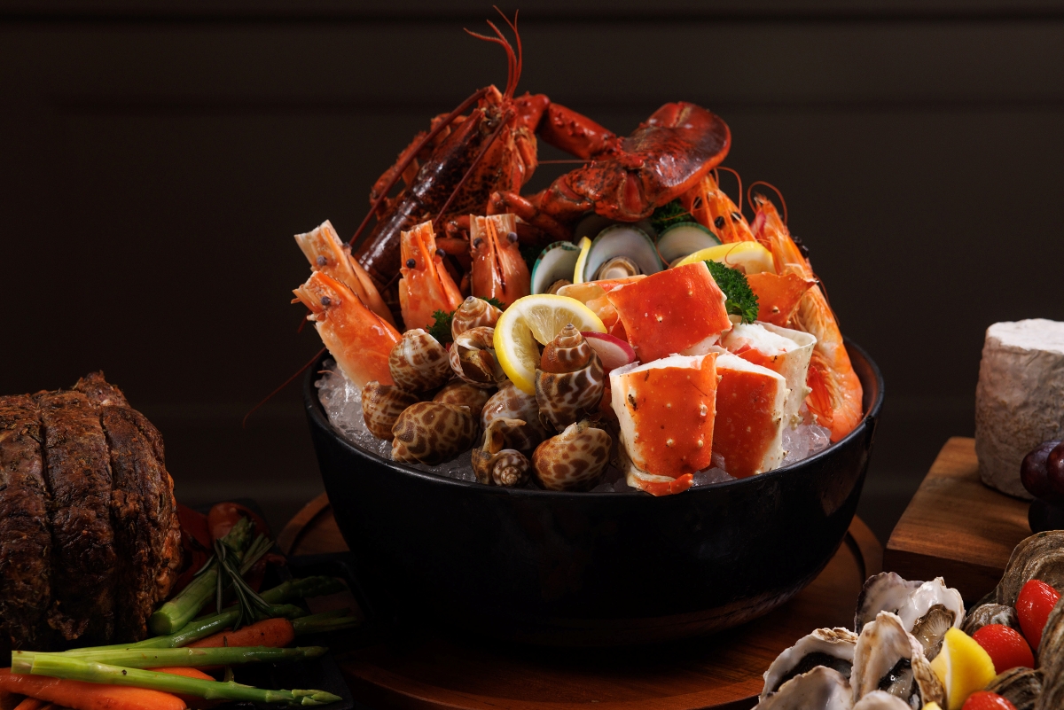 เริ่มต้นบุฟเฟ่ต์อาหารทะเลและอาหารนานาชาติมื้อค่ำระดับพรีเมียมด้วยอาหารทะเลนำเข้าสดใหม่ ไม่ว่าจะเป็นหอยนางรมสดไอริส (Irish Oyster) หอยนางรม ฟิน เดอ แคลร์ (Fine De Claire Oyster) ไข่ปลาคุณภาพนานาชนิด เช่น อัฟรูกา คาเวียร์ (Avruga Caviar) ไข่ปลาแซลมอน (Salmon Roe) ไข่ปลาลัมพิชสีดำ (Black Lumpfish) และไข่ปลาลัมพิชสีแดง (Red Lumpfish) นอกจากนั้นยังมีอาหารทะเลลวกสุกกำลังพอดีแช่เย็นฉ่ำบนน้ำแข็ง ได้แก่ ขาปูยักษ์สีทอง (Golden King Crab) แคนาเดียนล็อบสเตอร์ (Canadian Lobster) กุ้งแม่น้ำและกุ้งขาวลวก หอยแมลงภู่นิวซีแลนด์ (New Zealand Green Mussels) และปูม้านึ่ง
