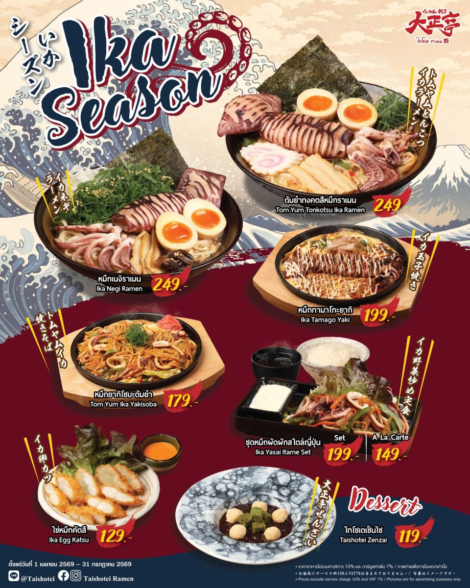 ไทโชเตไม่ได้ขายแค่อาหาร ที่นี่มีบรรยากาศอบอุ่นสไตล์ญี่ปุ่นและการบริการจากทีมที่มีประสบการณ์นับสิบปี นอกจาก “Ika Season” แล้ว ยังมีกระทะร้อน ซูชิ ซาชิมิ และของหวานอีกเต็มเมนูรอสำรวจ เหมาะทั้งแวะคนเดียวระหว่างพักงาน หรือนัดกินกับเพื่อนหลังเดินชมงานแคมเปญนี้มีให้สัมผัสถึงแค่ 31 กรกฎาคม 2569 เท่านั้น พบกันที่ ร้านไทโชเต ณ ชั้น 1 ฟู้ดเอเทรี่ยม อาคารชาเลนเจอร์ 3 อิมแพ็ค เมืองทองธานี เปิดบริการทุกวัน เวลา 11.00 – 20.00 น. สำรองความอร่อย โทร. 02-833-4284 หรือ 064-184-7108 ติดตามรายละเอียดเพิ่มเติมได้ทางเฟซบุ๊ก: TaishoteiRamen และอินสตาแกรม: taishotei_ramen