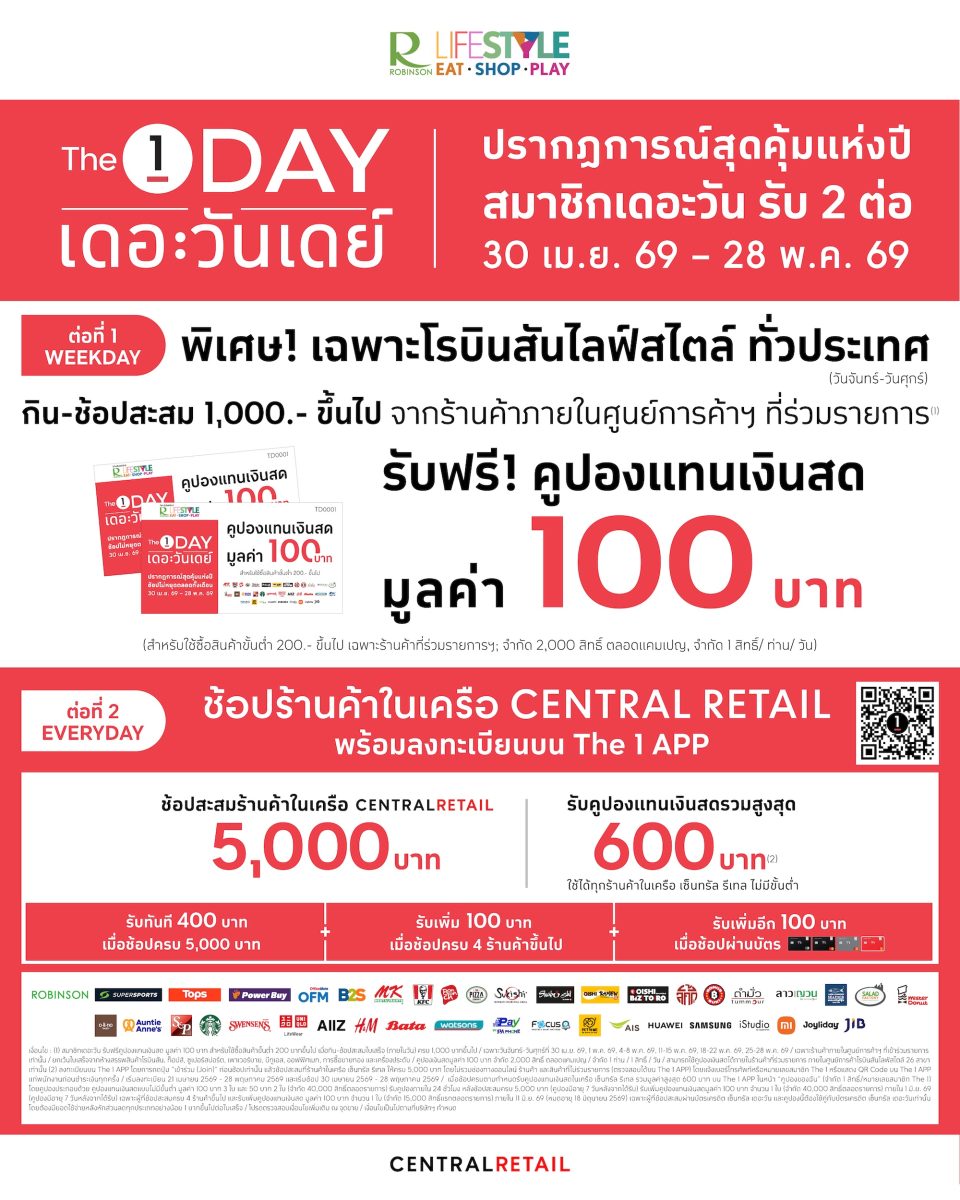 ศูนย์การค้าโรบินสันไลฟ์สไตล์ ในเครือเซ็นทรัล รีเทล ร่วมกับ The 1 เปิดตัวโปรโมชันสุดเอ็กซ์คลูซีฟ “The 1 Day” ปรากฏการณ์สุดคุ้มแห่งปี ที่ยกระดับความคุ้มค่าในทุกการใช้จ่ายจากร้านค้าภายในศูนย์การค้าฯ และแบรนด์พันธมิตรในเครือเซ็นทรัล รีเทล ตอกย้ำบทบาทของโรบินสันไลฟ์สไตล์ในฐานะศูนย์กลางชีวิตของทุกคน หรือ Central to Life ที่พร้อมตอบโจทย์ทั้งการกิน ช้อป และการใช้เวลาร่วมกันในครอบครัว ผ่านสิทธิพิเศษที่เข้าถึงได้ง่ายและคุ้มค่า ตั้งแต่วันที่ 30 เม.ย. 69 – 28 พ.ค. 69 ที่โรบินสันไลฟ์สไตล์ทุกสาขา ทั่วประเทศ