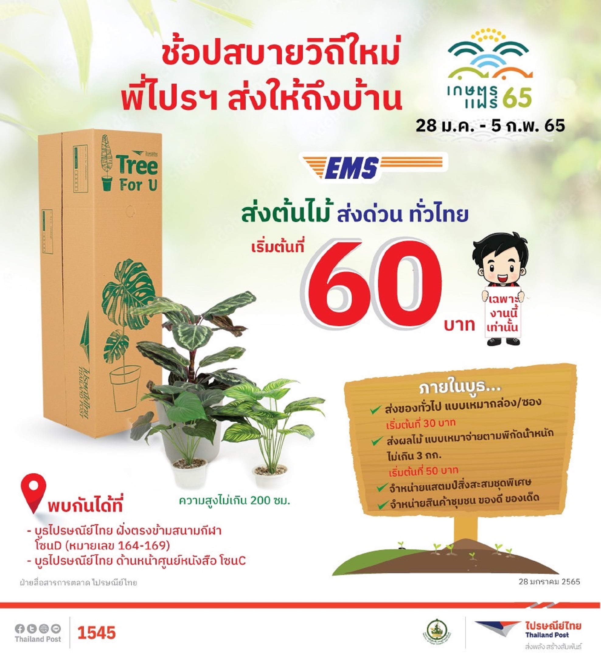 บริษัท ไปรษณีย์ไทย จำกัด ร่วมกับมหาวิทยาลัยเกษตรศาสตร์ บางเขน สนับสนุนงานเกษตรแฟร์ ประจำปี 2565 ที่จัดขึ้นภายใต้มาตรการดูแลและป้องกันโควิด-19 อย่างเคร่งครัด โดยหนุนประชาชน และร้านค้าภายในงาน ผ่านการมอบโปรโมชันค่าขนส่งในราคาพิเศษเฉพาะผู้เข้าร่วมงาน เพื่อความสะดวกระหว่างการเที่ยวชมงาน สามารถฝากส่งสิ่งของได้หลากหลายชนิดทั้งของกินของใช้ ต้นไม้ ผลไม้ สินค้าเกษตรแปรรูป ฯลฯ ในบริการส่งด่วน EMS ที่ส่งได้ทุกวัน ถึงทุกที่ทั่วไทย ในราคาทั้งแบบเหมากล่อง โดยไม่ต้องชั่งน้ำหนัก และเหมาจ่ายตามพิกัดน้ำหนัก ตั้งแต่วันนี้ – 5 กุมภาพันธ์ 2565
