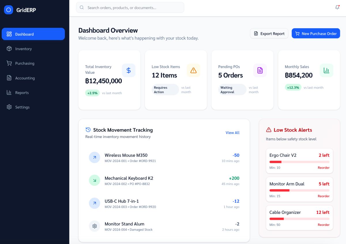 หนึ่งในจุดเด่นสำคัญของ GridWMS คือฟังก์ชัน AI Native Assistant ที่ช่วยวิเคราะห์ข้อมูลสต็อกแบบอัตโนมัติ ไม่เพียงแค่รายงานสถานะสินค้า แต่ยังสามารถแจ้งเตือนสินค้าที่ใกล้หมด วิเคราะห์แนวโน้มการใช้งาน และเสนอคำแนะนำเบื้องต้นเพื่อสนับสนุนการวางแผนจัดซื้อและบริหารสินค้าคงคลัง ช่วยให้ผู้บริหารสามารถตัดสินใจบนพื้นฐานข้อมูล (Data-Driven Decision) ได้อย่างมั่นใจมากยิ่งขึ้น
