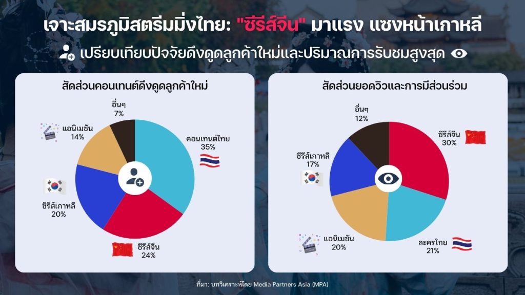 ด้านสตรีมมิ่ง รายงานเผยให้เห็นว่า 70.7% ของผู้ใช้งานอินเทอร์เน็ตไทยรับชมทีวีผ่านแพลตฟอร์มสตรีมมิ่ง โดยใช้เวลาเฉลี่ย 4 ชั่วโมง 35 นาทีต่อสัปดาห์ และใช้จ่ายกับสตรีมมิ่งมากที่สุดถึง 33.2% ของการซื้อคอนเทนต์ออนไลน์ในแต่ละเดือน นอกจากนี้ ไทยยังได้ก้าวขึ้นเป็นตลาดวิดีโอออนดีมานด์ (SVOD) ที่ใหญ่ที่สุดในอาเซียน ขับเคลื่อนด้วย “คอนเทนต์รสไทย” โดยเฉพาะซีรีส์ BL/GL ที่ครองส่วนแบ่ง 53% ของตลาดเอเชียและถูกซื้อลิขสิทธิ์ไปกว่า 190 ประเทศ