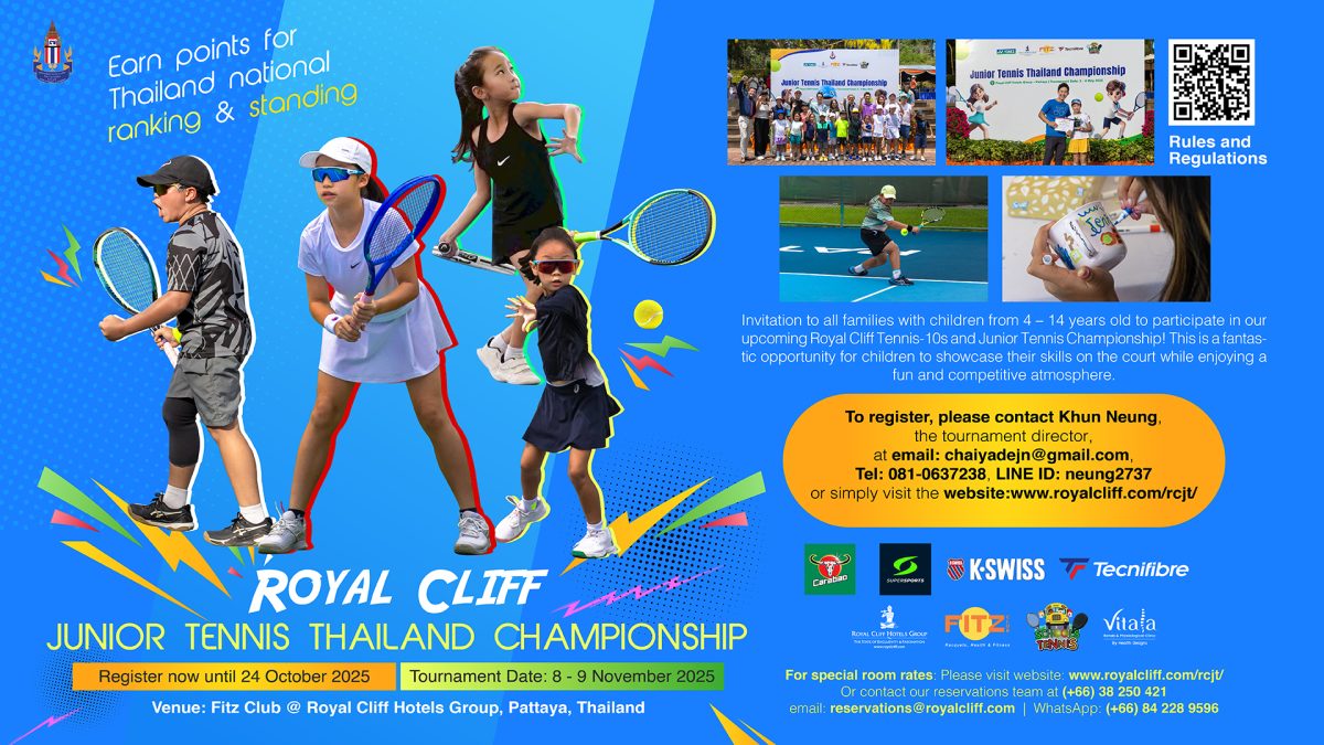 พัทยา ประเทศไทย – ข่าวดี! การแข่งขัน รอยัล คลิฟ จูเนียร์ เทนนิส ไทยแลนด์ แชมเปี้ยนชิพ ครั้งที่ 4 กำลังจะกลับมาเป็นรอบที่ 2 ของปีนี้ เนื่องจากได้รับการตอบรับอย่างดีจากการแข่งขันครั้งที่ผ่านมา และตามคำเรียกร้องจากหลายครอบครัวที่อยากให้จัดอีกครั้ง การแข่งขันจะจัดขึ้นในวันที่ 8 – 9 พฤศจิกายน 2568 ณ ฟิตซ์ คลับ – แร็กเก็ต เฮลท์ แอนด์ ฟิตเนส ขอเชิญชวนนักเทนนิสเยาวชนอายุระหว่าง 4 – 14 ปี ทุกระดับฝีมือ เข้าร่วมในศึกอันน่าตื่นเต้นครั้งนี้ เพื่อเปิดโอกาสให้ได้พบปะเพื่อนนักกีฬา แลกเปลี่ยนประสบการณ์ พัฒนาทักษะการเล่น และสัมผัสบรรยากาศการแข่งขันจริง นอกจากนี้ ผู้เข้าร่วมแข่งขันยังสามารถสะสมคะแนนเพื่อนำไปใช้ในการจัดอันดับนักเทนนิสเยาวชนในประเทศไทยอีกด้วย โดยการแข่งขันในปีนี้ ได้รับการสนับสนุนอย่างดีจาก ซูเปอร์สปอร์ต, เค-สวิส, คาราบาวกรุ๊ป จำกัด, เทคนิไฟเบอร์, ไวทาลา และ เทนนิส-10