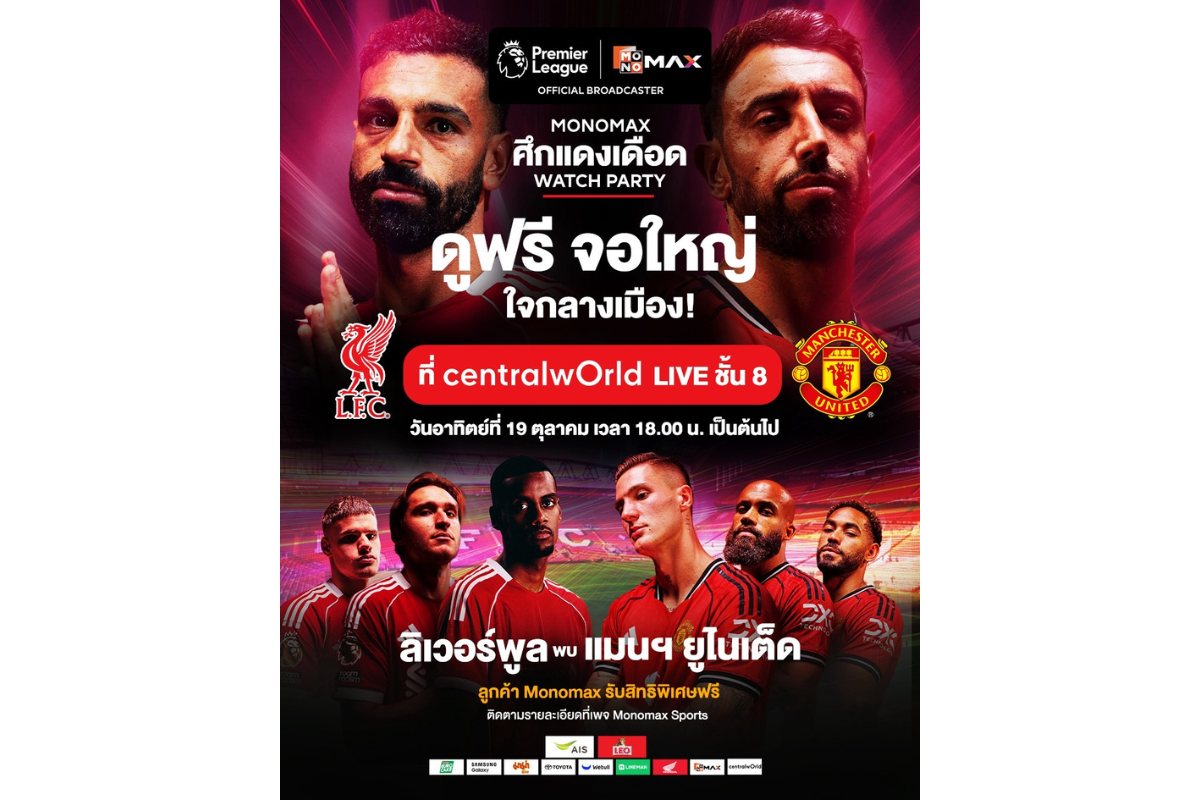 Monomax แพลตฟอร์มหลักในการถ่ายทอดสดฟุตบอลพรีเมียร์ลีกและเอมิเรตส์เอฟเอคัพตลอด 6 ฤดูกาล เชิญชวนมาร่วมกระหึ่มความมันส์ระดับโลกกับแมตช์ที่แฟนบอลทุกคนรอคอย “ลิเวอร์พูล ปะทะ แมนเชสเตอร์ ยูไนเต็ด” ในบรรยากาศสุดมันส์บนจอใหญ่เต็มอิ่ม ที่งาน “MONOMAX ศึกแดงเดือด WATCH PARTY” ในวันอาทิตย์ที่ 19 ตุลาคม 2568 ตั้งแต่เวลา 18.00 น. เป็นต้นไป ณ Centralworld LIVE ชั้น 8 เซ็นทรัลเวิลด์