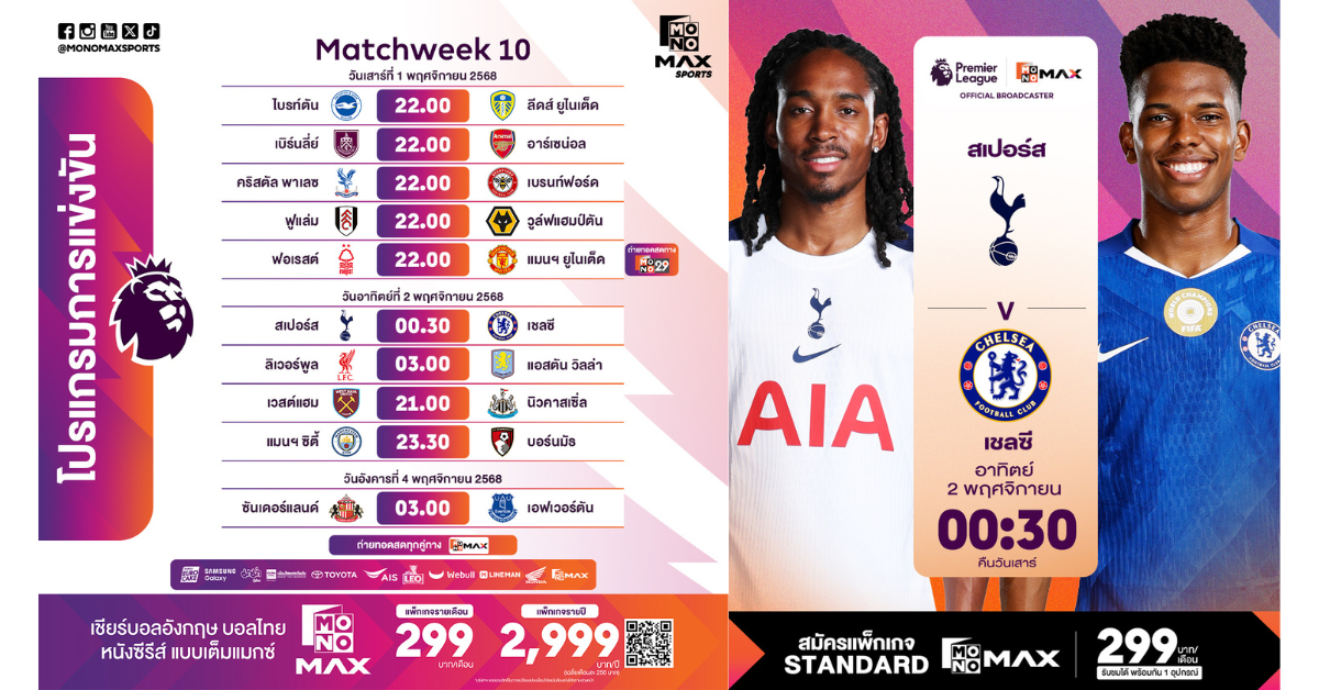 มันส์ต่อเนื่อง เวลา 00.30 น. วันอาทิตย์ที่ 2 พฤศจิกายน 2568 (คืนวันเสาร์ที่ 1 พฤศจิกายน 2568) เมื่อ ท็อตแน่ม ฮอตสเปอร์ เตรียมเปิดศึก “ลอนดอนดาร์บี้แมตช์” กับ เชลซี เกมนี้ ถือเป็นคู่เอกที่แฟนบอลทั่วโลกห้ามพลาด ต่อด้วยคู่ดึกเวลา 03.00 น. “หงส์แดง” ลิเวอร์พูล เปิดแอนฟิลด์รับการมาเยือนของ แอสตัน วิลล่า รับชมได้ที่ Monomax