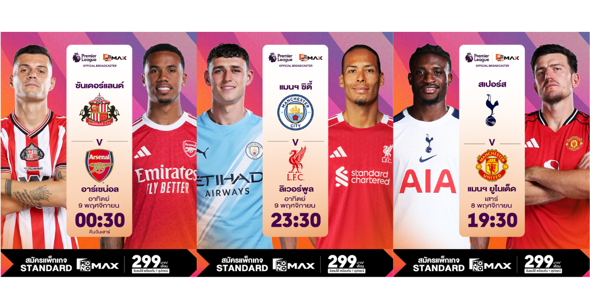 ข้ามเข้าสู่ วันอาทิตย์ที่ 9 พฤศจิกายน 2568 เวลา 00.30 น.  (คืนวันเสาร์ที่ 8 พฤศจิกายน 2568) “ซันเดอร์แลนด์” เปิดบ้านรับ  “อาร์เซน่อล” ปืนใหญ่ฟอร์มร้อนแรงยังคงรักษาอันดับจ่าฝูง ก่อนจะปิดท้ายด้วยเกมเช้ามืดใน เวลา 03.00 น. “เชลซี” พบ “วูล์ฟแฮมป์ตัน วันเดอเรอร์ส” ที่พร้อมวัดศักดิ์ศรีความเก๋าของสิงห์บลูในถิ่นสแตมฟอร์ด บริดจ์ ทั้งหมดถ่ายทอดสดทาง Monomax