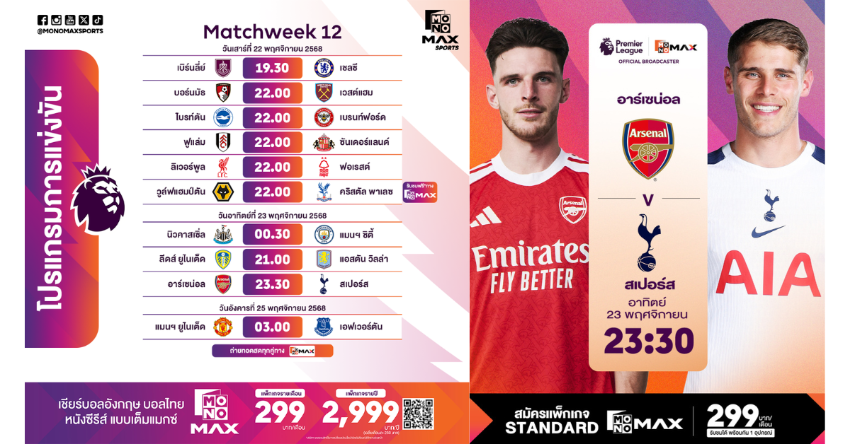 ศึกพรีเมียร์ลีกฯ สัปดาห์ที่ 12 “Monomax” ยิงสดครบทุกสนาม ลอนดอนดาร์บี้ “ปืนใหญ่-ไก่เดือยทอง” บิ๊กแมตซ์ “สาลิกาดงปะทะเรือใบ”