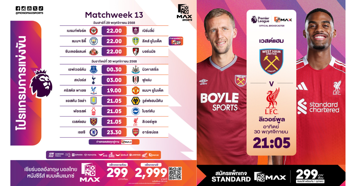 ต่อเนื่องใน คืนวันอาทิตย์ที่ 30 พฤศจิกายน 2568 เวลา 00.30 น. (คืนวันเสาร์ที่ 29 พฤศจิกายน 2568) รับชมทาง Monomax เป็นการพบกันระหว่าง เอฟเวอร์ตัน ซึ่งต้องการแต้มสำคัญเพื่อขยับหนีพื้นที่ท้ายตาราง ปะทะกับ นิวคาสเซิล ยูไนเต็ด มีเป้าหมายชัดเจนในการไต่อันดับลุ้นท็อปซิกส์ ต่อด้วย เวลา 03.00 น. ท็อตแนม ฮอตสเปอร์ พบ ฟูแล่ม ซึ่งแม้ไม่ใช่ดาร์บี้โดยตรง แต่เป็นเกมที่แฟนบอลมักให้ความสนใจไม่น้อย