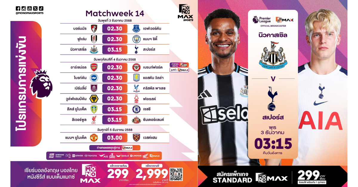 ประเดิมสัปดาห์ใน วันพุธที่ 3 ธันวาคม 2568 เวลา 02.30 น. (คืนวันอังคารที่ 2 ธันวาคม 2568) ถ่ายทอดสดทาง Monomax ด้วยเกมที่น่าจับตาพร้อมกัน 2 คู่ เริ่มจาก ฟูแล่ม เปิดบ้านรับการมาเยือนของ แมนเชสเตอร์ ซิตี้ ในศึกสำคัญที่มีผลต่อการลุ้นจ่าฝูงอย่างมาก ขณะที่ บอร์นมัธ ต้องสู้สุดกำลังเพื่อเก็บแต้มสำคัญในการเจอ เอฟเวอร์ตัน ก่อนปิดท้ายค่ำคืนนี้ด้วยบิ๊กแมตช์ เวลา 03.15 น. เมื่อ นิวคาสเซิล ยูไนเต็ด เปิดรังต้อนรับ ท็อตแน่ม ฮ็อทสเปอร์ การเจอกันของสองทีมที่เต็มไปด้วยหมัดแลกหมัดและจังหวะพลิกเกมตลอดเวลา