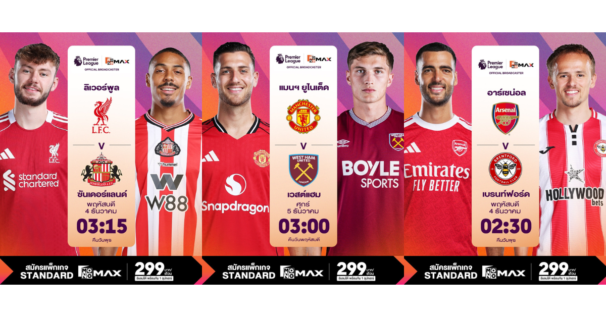 เข้าสู่ วันพฤหัสที่ 4 ธันวาคม 2568 เวลา 02.30 น. (คืนวันพุธที่ 3 ธันวาคม 2568) ค่ำคืนที่เต็มไปด้วยเกมสำคัญในเวลาพร้อมกันถึง 4 คู่ รับชมทาง Monomax เมื่อ ไบรท์ตันเตรียมเดินเกมครองบอลพบ แอสตัน วิลล่า ทีมที่อันตรายในจังหวะสวนกลับ, ด้าน เบิร์นลีย์หวังใช้แรงเชียร์ในบ้านเพื่อชิงแต้มจาก คริสตัล พาเลซ, วูล์ฟแฮมป์ตัน วันเดอเรอร์สเตรียมเจอกับ น็อตติ้งแฮม ฟอเรสต์ ในเกมเชิงแท็กติกที่สู้กันทุกจังหวะ และจ่าฝูง อาร์เซน่อล จะเปิดสนามเอมิเรตส์รับมือ เบรนท์ฟอร์ด เพื่อครองอันดับหัวตาราง ซึ่งคู่นี้ถ่ายทอดสดพิเศษทั้ง Monomax และ ช่อง MONO29 จากนั้นในช่วงดึก เวลา 03.15 น. มีให้ลุ้นพร้อมกัน 2 คู่ เริ่มจาก ลีดส์ ยูไนเต็ด เปิดบ้านพบ เชลซี และ ลิเวอร์พูล พร้อมลงสนามรับ ซันเดอร์แลนด์ กับชัยชนะพร้อมในเส้นทางลุ้นอันดับบนของลีก ยิงสดทาง Monomax