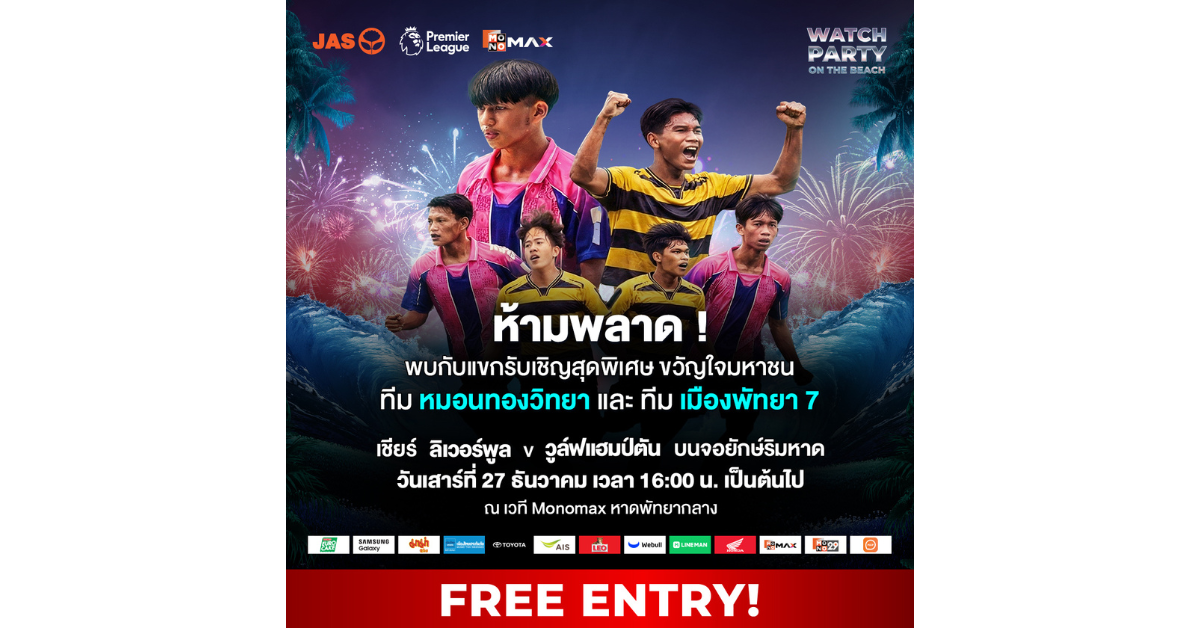 บริษัท จัสมิน อินเตอร์เนชั่นแนล จำกัด (มหาชน) หรือ JAS ผู้ถือลิขสิทธิ์ฟุตบอลพรีเมียร์ลีกอังกฤษ และเอมิเรตส์เอฟเอคัพอย่างเป็นทางการ ร่วมกับ Monomaxแพลตฟอร์มหลักในการถ่ายทอดสดฟุตบอลพรีเมียร์ลีกและเอมิเรตส์เอฟเอคัพตลอด 6ฤดูกาล ร่วมกันจัดงาน “Monomax : Watch Party on the Beach” เพื่อถ่ายทอดสดฟุตบอลพรีเมียร์ลีกคู่บิ๊กแมตช์ “ลิเวอร์พูล” พบ “วูล์ฟแฮมป์ตัน” ท่ามกลางบรรยากาศริมชายหาดเมืองพัทยาเป็นครั้งแรกในไทย วันเสาร์ที่ 27 ธันวาคม 2568 ตั้งแต่เวลา 16.00 น. เป็นต้นไป ณ ชายหาดพัทยากลาง