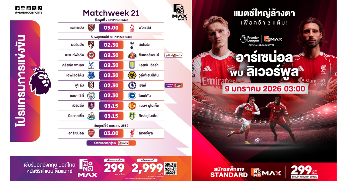 ปิดท้ายโปรแกรมพรีเมียร์ลีกกลางสัปดาห์ที่แฟนบอลทั่วโลกจับตาในวันศุกร์ที่ 9 มกราคม 2569 Monomax ถ่ายทอดสดซูเปอร์บิ๊กแมตช์ เวลา 03.00 น. อาร์เซนอล เปิดสนามเอมิเรตส์ สเตเดี้ยม รับการมาเยือนของ ลิเวอร์พูล ศึกยักษ์ชนยักษ์ที่ความหมายเกินกว่าสามแต้ม เกมนี้ “ปืนใหญ่” เดินหน้าเก็บชัยชนะเพื่อรักษาเส้นทางการลุ้นแชมป์ในช่วงครึ่งหลังของฤดูกาล ขณะที่ “หงส์แดง” พร้อมบุกมาแบ่งแต้ม การพบกันของสองทีมยักษ์ใหญ่ครั้งนี้อาจกลายเป็นจุดเปลี่ยนสำคัญที่กำหนดทิศทางการลุ้นแชมป์และพื้นที่ยุโรปในระยะยาว ปิดฉากสัปดาห์แห่งความเดือดของพรีเมียร์ลีกได้อย่างสมศักดิ์ศรี