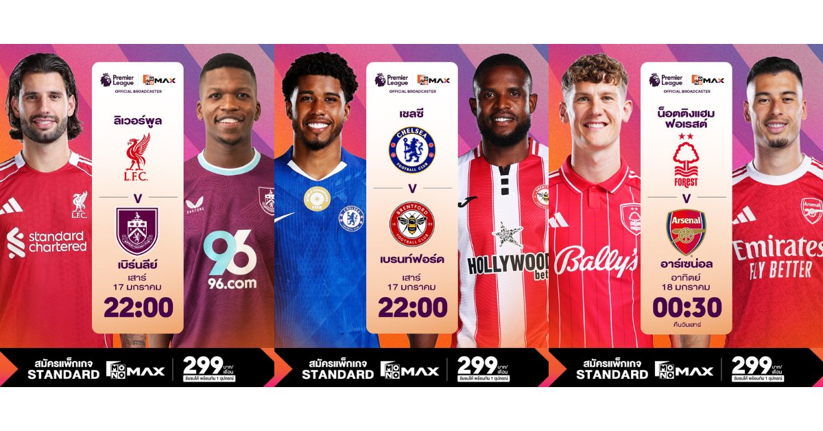 เครื่องร้อนกันตั้งแต่หัวค่ำ วันเสาร์ที่ 17 มกราคม 2569 เวลา 19.30 น. Monomaxถ่ายทอดสดศึกไฮไลต์ประจำสัปดาห์ “แมนเชสเตอร์ ดาร์บี้” เมื่อ แมนเชสเตอร์ ยูไนเต็ดเปิดบ้านปะทะ แมนเชสเตอร์ ซิตี้ เกมแห่งศักดิ์ศรีของสองขั้วเมือง โดยปีศาจแดงหวังใช้เสียงเชียร์ในโอลด์ แทรฟฟอร์ดหยุดความร้อนแรงของเรือใบสีฟ้า จากนั้นในช่วง เวลา22.00 น. แฟนบอลจะได้ลุ้นกันยาวกับโปรแกรมพร้อมกันถึง 5 คู่ เชลซี พบ เบรนท์ฟอร์ด ศึกลอนดอนดาร์บี้ที่สิงห์บลูส์ต้องการสามแต้มเพื่อรักษาพื้นที่หัวตาราง, การพบกันของสองทีมอันดับกลางตาราง ลีดส์ ยูไนเต็ด เปิดบ้านรับ ฟูแล่ม เกมนี้มีผลต่อการสร้างความมั่นใจในช่วงครึ่งหลังฤดูกาล, ลิเวอร์พูล พบ เบิร์นลีย์ หงส์แดงมุ่งคว้าชัยเพื่อกดดันกลุ่มลุ้นแชมป์, ซันเดอร์แลนด์ พบ คริสตัล พาเลซ เกมสำคัญของทีมที่ต้องการแต้มหนีโซนอันตราย และ ท็อตแนม ฮ็อตสเปอร์ พบ เวสต์แฮม ยูไนเต็ด อีกหนึ่งลอนดอนดาร์บี้ที่เดือดทุกจังหวะ สเปอร์สลุ้นแต้มเพื่อขยับอันดับ ขณะที่ขุนค้อนพร้อมสู้ไม่ถอย โดยคู่นี้ถ่ายทอดสดทั้ง Monomax และ ช่อง MONO29 ก่อนจะต่อกันใน เวลา 00.30 น. วันอาทิตย์ที่ 18 มกราคม 2569 (คืนวันเสาร์ที่ 17 มกราคม 2569) Monomax ยิงสด น็อตติงแฮม ฟอเรสต์ เปิดบ้านรับมือ อาร์เซนอล ทีมลุ้นแชมป์ที่ยังต้องเก็บชัยชนะต่อเนื่องเพื่อรักษาความกดดันบนหัวตาราง เกมนี้ปืนใหญ่พลาดไม่ได้ หากหวังยืนระยะในเส้นทางลุ้นแชมป์