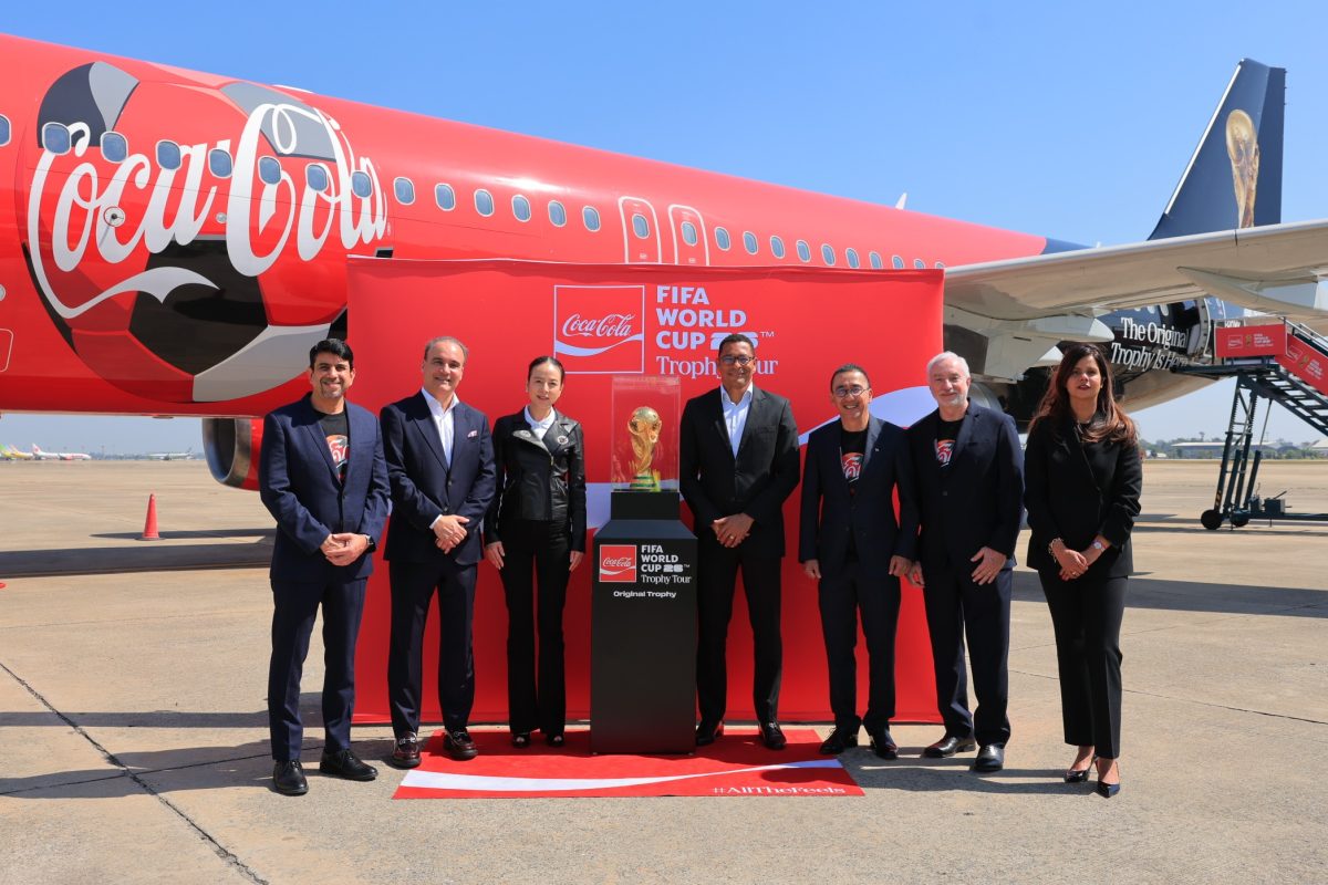 พิธีต้อนรับถ้วยฟุตบอลโลกได้รับเกียรติจาก เซลแมน คาเรกา (ที่ 4 จากซ้าย) ประธานภูมิภาคอาเซียนและแปซิฟิกตอนใต้ เดอะ โคคา-โคล่า คัมปะนี และ จิลแบร์โต ซิลวา (Gilberto Silva) (ที่ 5 จากซ้าย) ตำนานนักเตะฟุตบอลโลกจากบราซิล ผู้เคยคว้าแชมป์ฟุตบอลโลกปี 2002 ซึ่งมาร่วมต้อนรับและถ่ายภาพกับถ้วย FIFA World Cup Trophy ของจริง ซึ่งทำจากทองคำ 18 กะรัต