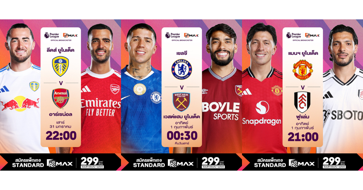 ประเดิมความมันส์พร้อมกันสามคู่ในช่วงค่ำคืน วันเสาร์ที่ 31 มกราคม 2569 เวลา22.00 น. Monomax ถ่ายทอดสดเริ่มจาก ไบรท์ตัน แอนด์ โฮฟ อัลเบี้ยน ทีมจากกลุ่มกลางตาราง เปิดบ้านรับมือ เอฟเวอร์ตัน ที่ยังต้องการแต้มเพื่อสร้างความมั่นใจและขยับสถานการณ์บนตาราง ต่อเนื่องด้วยเกมที่ถูกจับตามองอย่าง ลีดส์ ยูไนเต็ด เปิดรังดวล อาร์เซนอล ทีมระดับหัวตาราง ซึ่งต้องการรักษาความต่อเนื่องในการลุ้นแชมป์ โดยคู่นี้ถ่ายทอดสดทั้ง Monomax และ ช่อง MONO29 ขณะที่อีกสนาม วูล์ฟแฮมป์ตัน วันเดอเรอร์ส พบ บอร์นมัธ เป็นศึกของสองทีมที่ต้องการชัยชนะเพื่อสร้างความมั่นใจในช่วงครึ่งหลังของฤดูกาล ต่อเนื่อง เวลา 00.30 น. วันอาทิตย์ที่ 1 กุมภาพันธ์ 2569 (คืนวันเสาร์ที่ 31 มกราคม 2569) กับศึกลอนดอนดาร์บี้ระหว่าง เชลซี พบ เวสต์แฮม ยูไนเต็ด ที่ทั้งสองฝ่ายต่างไม่มีพื้นที่ให้ความผิดพลาด และ เวลา 03.00 น. ลิเวอร์พูล จะเปิดแอนฟิลด์รับมือ นิวคาสเซิล ยูไนเต็ด เกมรุกปะทะเกมรุกที่ถูกยกให้เป็นหนึ่งในไฮไลต์ของสัปดาห์ รับชมทาง Monomax