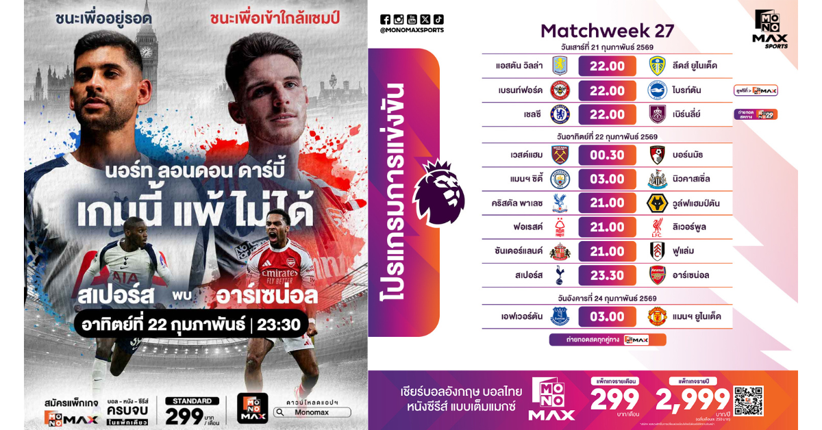 คืนวันเสาร์ที่ 21 กุมภาพันธ์ 2569 เปิดฉาก เวลา 22.00 น. Monomax ถ่ายทอดสดสามคู่พร้อมกัน เริ่มจาก แอสตัน วิลล่า พบ ลีดส์ ยูไนเต็ด เจ้าถิ่นยังมีลุ้นพื้นที่ยุโรป ขณะที่ทีมเยือนต้องการแต้มเพื่อขยับหนีโซนอันตราย ด้าน เบรนท์ฟอร์ด พบ ไบรท์ตัน แอนด์ โฮฟ อัลเบียน เป็นการเจอกันของสองทีมกลางตารางที่อันดับสูสี ผู้ชนะมีสิทธิ์ขยับขึ้นครึ่งบนทันที และอีกคู่ เชลซี ดวล เบิร์นลีย์ โดยเชลซีจำเป็นต้องเร่งเก็บคะแนนไล่จี้กลุ่มท็อปโฟร์โดยคู่นี้ถ่ายทอดสดทั้ง Monomax และ ช่อง MONO29 จากนั้นเข้าสู่วันอาทิตย์ที่ 22 กุมภาพันธ์ 2569 เวลา 00.30 น. (คืนวันเสาร์ที่ 21 กุมภาพันธ์ 2569) เวสต์แฮม ยูไนเต็ด พบ บอร์นมัธ เกมนี้มีผลต่อทั้งพื้นที่ยุโรปและโซนล่าง ก่อนที่ เวลา 03.00 น. จะเป็นบิ๊กแมตช์ แมนเชสเตอร์ ซิตี้ พบ นิวคาสเซิล ยูไนเต็ด ซึ่งถูกยกให้เป็นหนึ่งในคู่เอกของสัปดาห์ “เรือใบสีฟ้า” ต้องการชัยชนะเพื่อรักษาจังหวะไล่ล่าจ่าฝูง เกมนี้มีผลโดยตรงต่อเส้นทางลุ้นแชมป์