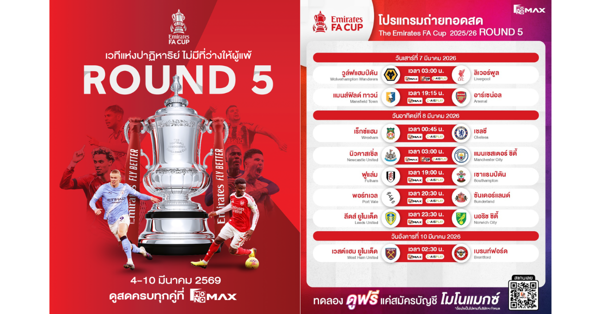 เกมน็อกเอาต์ที่ไม่มีโอกาสแก้ตัว พร้อมระเบิดความเข้มข้นตลอดคืนวันที่ 7–10 มีนาคม2569 ทุกคู่คือเดิมพันแห่งศักดิ์ศรี ทั้งทีมลุ้นแชมป์จากพรีเมียร์ลีกและม้ามืดที่หวังสร้างประวัติศาสตร์ โดยแฟนบอลชาวไทยสามารถติดตามชมการถ่ายทอดสดครบทุกแมตช์ผ่านทาง Monomax ร่วมลุ้นว่าใครจะฝ่าด่านหินรอบนี้ ทะยานสู่รอบ 8 ทีมสุดท้ายได้สำเร็จ ดังนี้