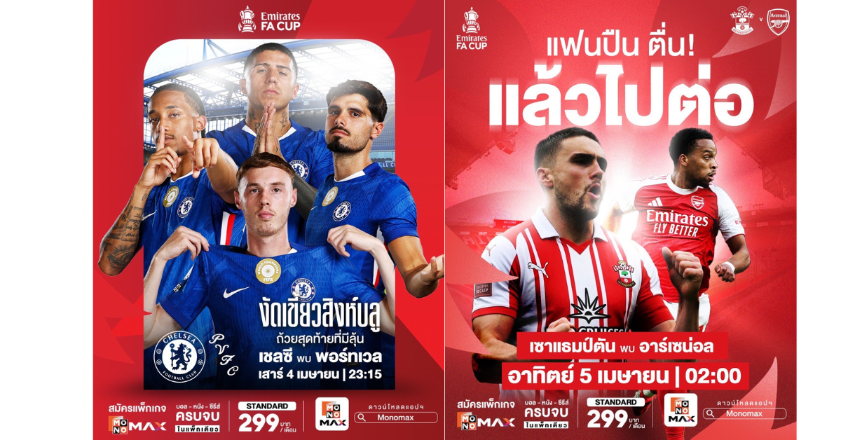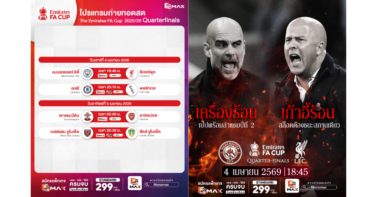 บริษัท จัสมินอินเตอร์เนชั่นแนล จำกัด (มหาชน) หรือ JAS เจ้าของลิขสิทธิ์ฟุตบอลพรีเมียร์ลีกและ The Emirates FA Cup เดินทางสู่โค้งชี้ชะตากับการแข่งขันศึกฟุตบอลถ้วยที่เก่าแก่ที่สุดในโลกอย่าง เอฟเอ คัพ (FA Cup) รอบก่อนรองชนะเลิศ ที่เดิมพันสูงถึงตั๋วเวมบลีย์! นำโดยบิ๊กแมตช์ห้ามพลาด แมนเชสเตอร์ ซิตี้ ปะทะ ลิเวอร์พูล พร้อมด้วยเกมลุ้นพลิกล็อกและศึกวัดคมของทีมฟอร์มแรง ครบทุกอารมณ์ทั้งความมัน ความกดดัน และโอกาสสร้างประวัติศาสตร์หน้าใหม่ของฟุตบอลถ้วยอังกฤษ! โดยแฟนบอลชาวไทยสามารถติดตามชมการถ่ายทอดสดครบทุกแมตช์ผ่านทาง Monomax