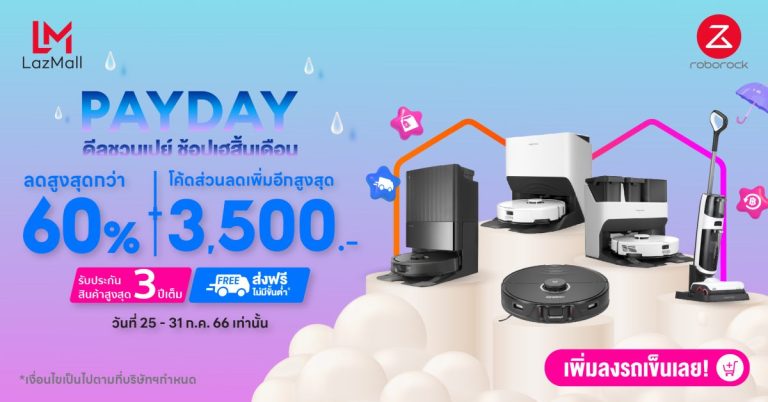 โรโบร็อค แบรนด์เครื่องดูดฝุ่นอัจฉริยะชั้นนำระดับโลก เปิดตัวโปรโมชั่นสุดพิเศษ PAYDAY มอบส่วนลดสูงสุดกว่า 60% พร้อมโค้ดส่วนลดเพิ่มอีกสูงสุดถึง 3,500 บาท แถมประกันสูงสุด 3 ปี สำหรับผลิตภัณฑ์ทุกรุ่น…