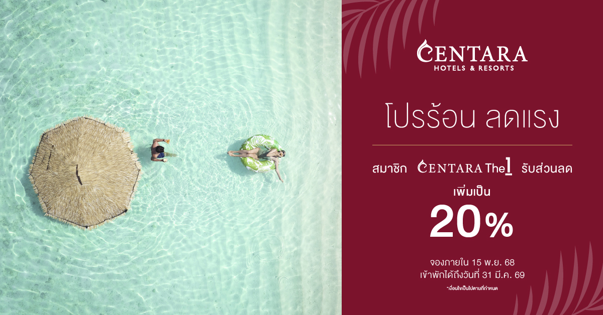 สมาชิก CentaraThe1 สามารถจองข้อเสนอสุดคุ้มนี้ได้ตั้งแต่วันนี้ ถึง 15 พฤศจิกายน 2568 สำหรับการเข้าพักตั้งแต่วันนี้ ถึง 31 มีนาคม 2569 เพื่อรับส่วนลดเพิ่มพิเศษ 20% ยิ่งไปกว่านั้น ลูกค้าที่จองโดยตรงผ่านหน้าเว็บไซต์หลักอย่างเป็นทางการของเซ็นทารายังจะได้รับสิทธิพิเศษอื่นๆ เพิ่มเติม อาทิ ส่วนลด 15% สำหรับอาหาร เครื่องดื่ม และสปา พร้อมบริการเช็คอินก่อนเวลาหรือเช็คเอาท์หลังเวลา และอื่นๆ อีกมากมาย