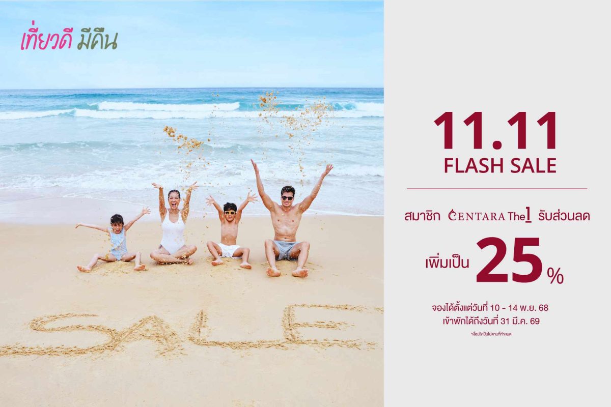 โรงแรมและรีสอร์ทในเครือเซ็นทารา เครือโรงแรมชั้นนำของประเทศไทย เอาใจขาเที่ยวแจกโปรใหญ่ “เซ็นทารา 11.11 แฟลชเซลล์” มอบส่วนลดห้องพักเพิ่มขึ้นเป็น 25% สำหรับสมาชิก CentaraThe1 พร้อมสิทธิประโยชน์หลากหลาย ณ โรงแรมและรีสอร์ทในเครือเซ็นทาราที่ร่วมรายการทั่วโลก