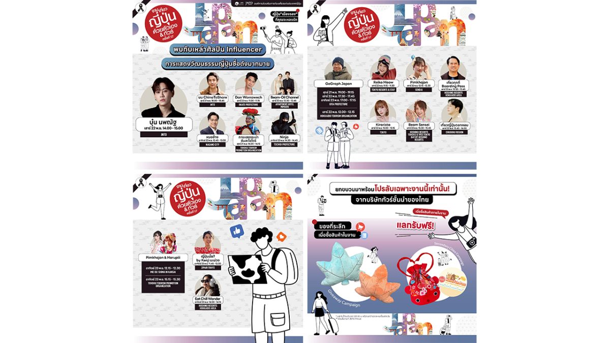 • วันอาทิตย์ที่ 23 พฤศจิกายน 2568 วันสุดท้ายของการจัดงาน พบกับเหล่า YouTuber และ Blogger สายเจแปนที่จะมาเล่าประสบการณ์เที่ยวญี่ปุ่นแบบ Unseen ที่จะทำให้คุณอยากแพ็กกระเป๋าทันที อาทิ แอดอ้น แอดมินเพจ Go!Graph Japan, นัท Eat Chill Wander, ฮารุปี้ Harupiii, เคนจิ หรือมะม่วง ญี่ปุ่นมั้ย? by Kenji และแขกรับเชิญพิเศษ หมอช้าง ทศพร ศรีตุลา พร้อมรับชมโชว์ “นินจา” สุดว้าวที่ส่งตรงจากประเทศญี่ปุ่น