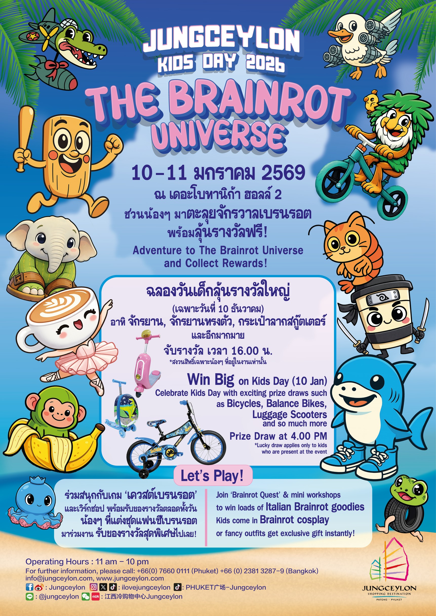 “จังซีลอน” ขอเชิญชวนน้องๆ หนูๆ มาร่วมสนุกกับกิจกรรมวันเด็กปีนี้ ในงาน “Jungceylon Kids Day 2026” ตอน The Brainrot Universe ที่จะจัดขึ้นในระหว่างวันที่ 10 – 11 มกราคม 2569 ตั้งแต่เวลา 11.00 – 22.00 น. ณ โซนเดอะโบทานิก้า ฮอลล์2 ศูนย์การค้าจังซีลอน ป่าตอง ภูเก็ต