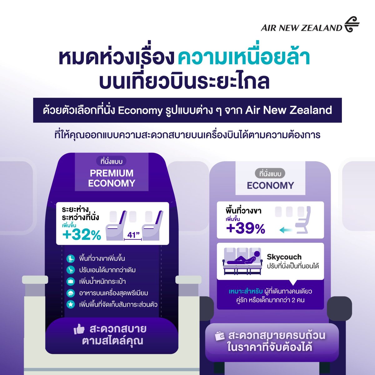 “ด้วยระยะทางและตำแหน่งที่ตั้งของประเทศนิวซีแลนด์ เราจึงมุ่งมั่นยกระดับประสบการณ์การเดินทางระยะไกลให้ดีที่สุด โดยให้ความสำคัญกับการพักผ่อนและความสะดวกสบายตลอดการเดินทาง เพราะเราเข้าใจดีว่าการได้เดินทางถึงจุดหมายโดยไม่รู้สึกอ่อนล้าสามารถยกระดับประสบการณ์การเดินทางตลอดทั้งทริปได้อย่างแท้จริง ข้อมูลเชิงลึกเหล่านี้ตอกย้ำแนวทางของเราในการออกแบบพื้นที่บนเครื่องบินที่ช่วยให้ผู้โดยสารได้พักผ่อนอย่างเต็มที่ และเพลิดเพลินกับทุกช่วงของการเดินทาง สำหรับ Air New Zealand ความสะดวกสบายไม่ใช่เพียงทางเลือก แต่เป็นหัวใจของการเดินทาง”